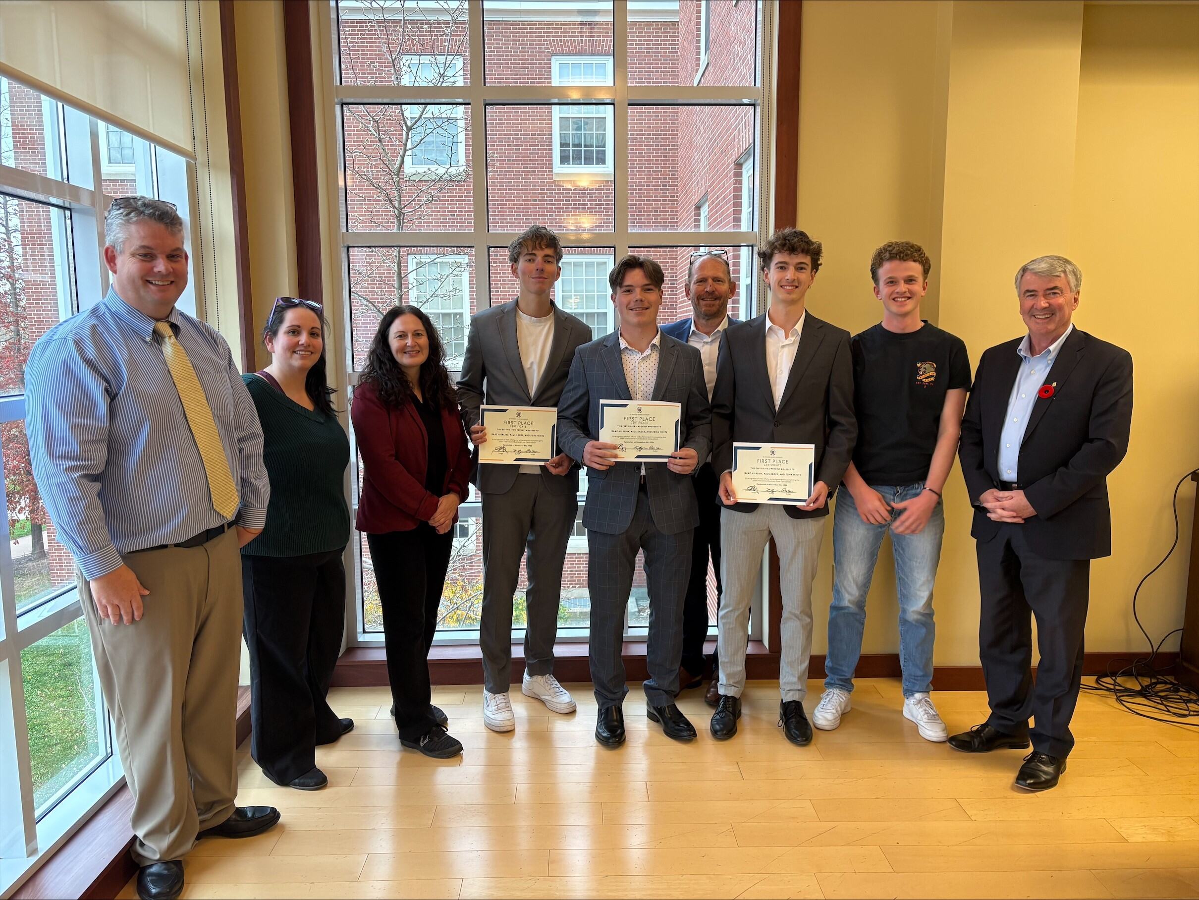 L-r, With the winning team are Dr. Mark Fuller (organizer), Prof. KC Rogers (judge), Prof. Rhonda McIver (judge), Paul Eades, Isaac Hierlihy, Dr. Neil Maltby (judge), Jona White, Luke White (mentor), and Schwartz School Dean of Business Dr. Tim Hynes.