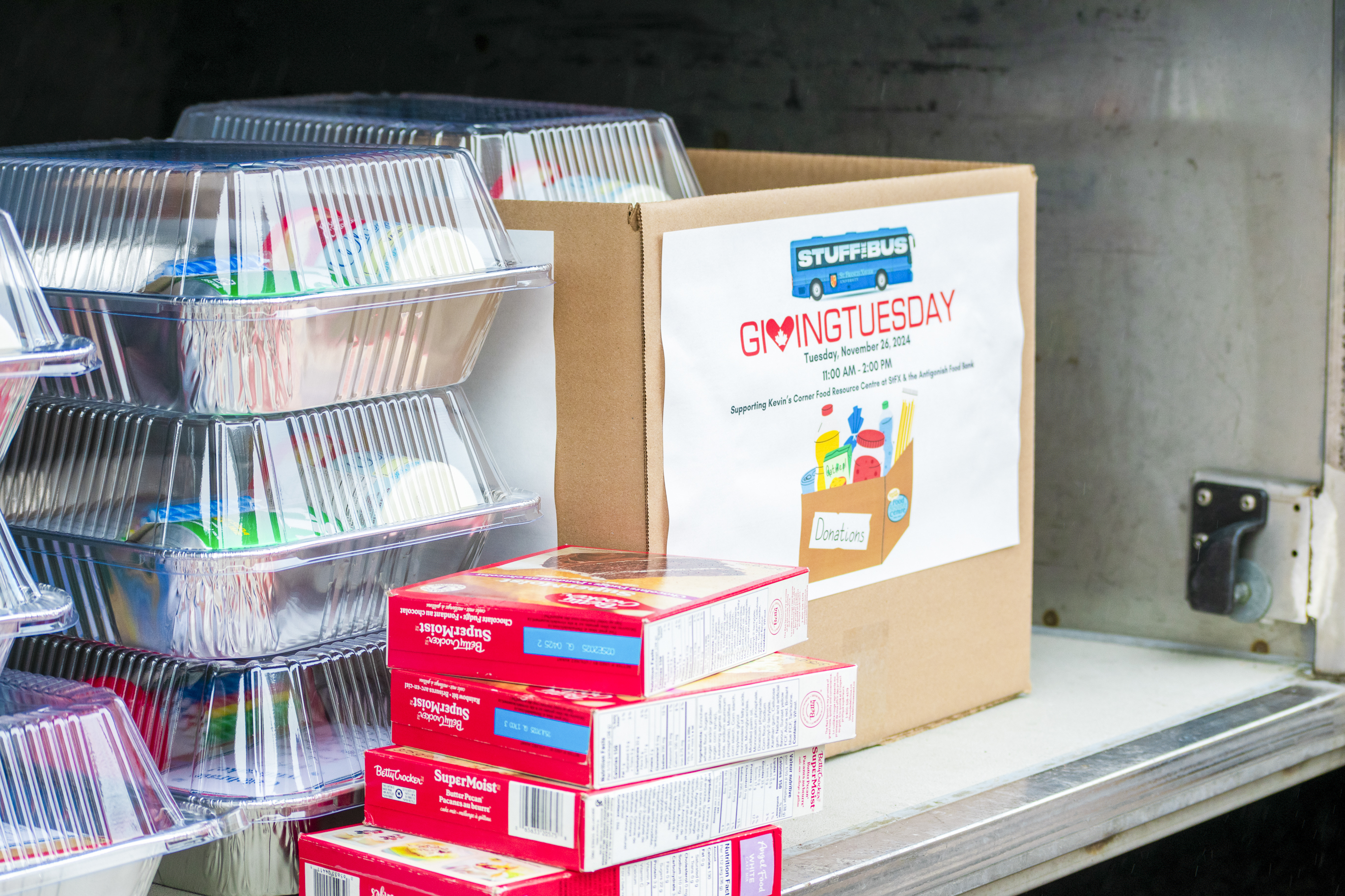 From all corners of campus, members of the StFX community teamed together Nov. 26 to make an impact on food insecurity, stuffing the ‘Xavier Express’ bus with donations of non-perishable food and hygiene items in support of two essential organizations: Kevin’s Corner Student Food Resource Centre at StFX and the Antigonish Community Food Bank, both members of Feed Nova Scotia.