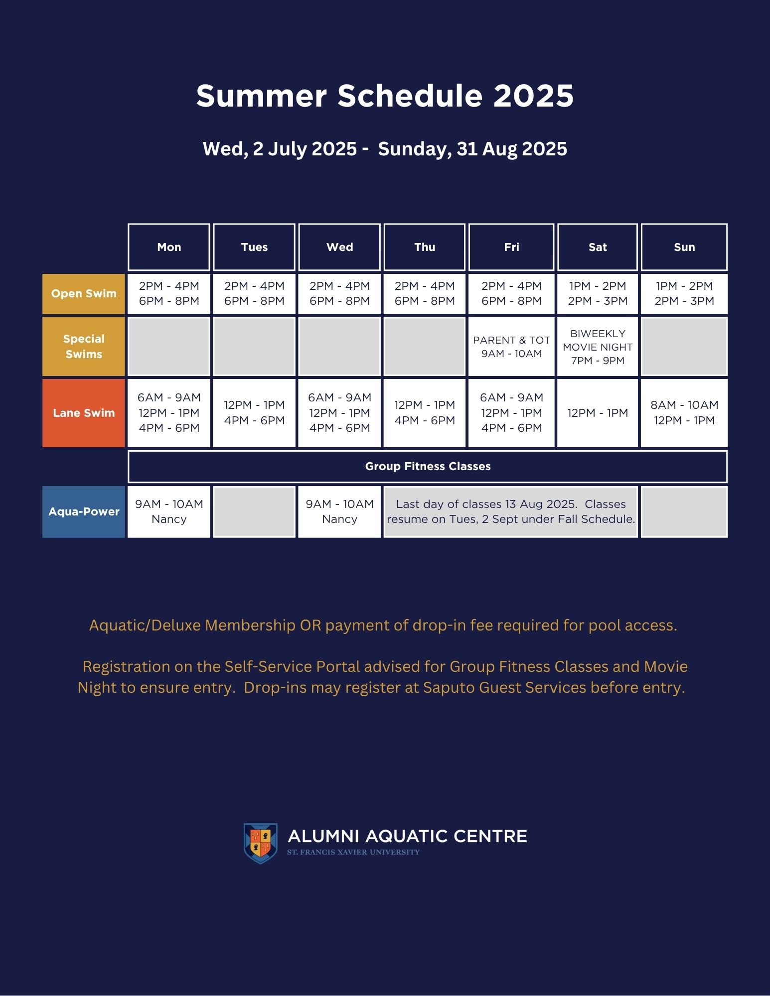 The Alumni Aquatic Centre is a 25-metre, six-lane swimming pool, located in the Amelia Saputo Centre at StFX. The facility is open to both the StFX and Antigonish community members. We offer a variety of Membership & Drop-In options to meet your aquatic needs.