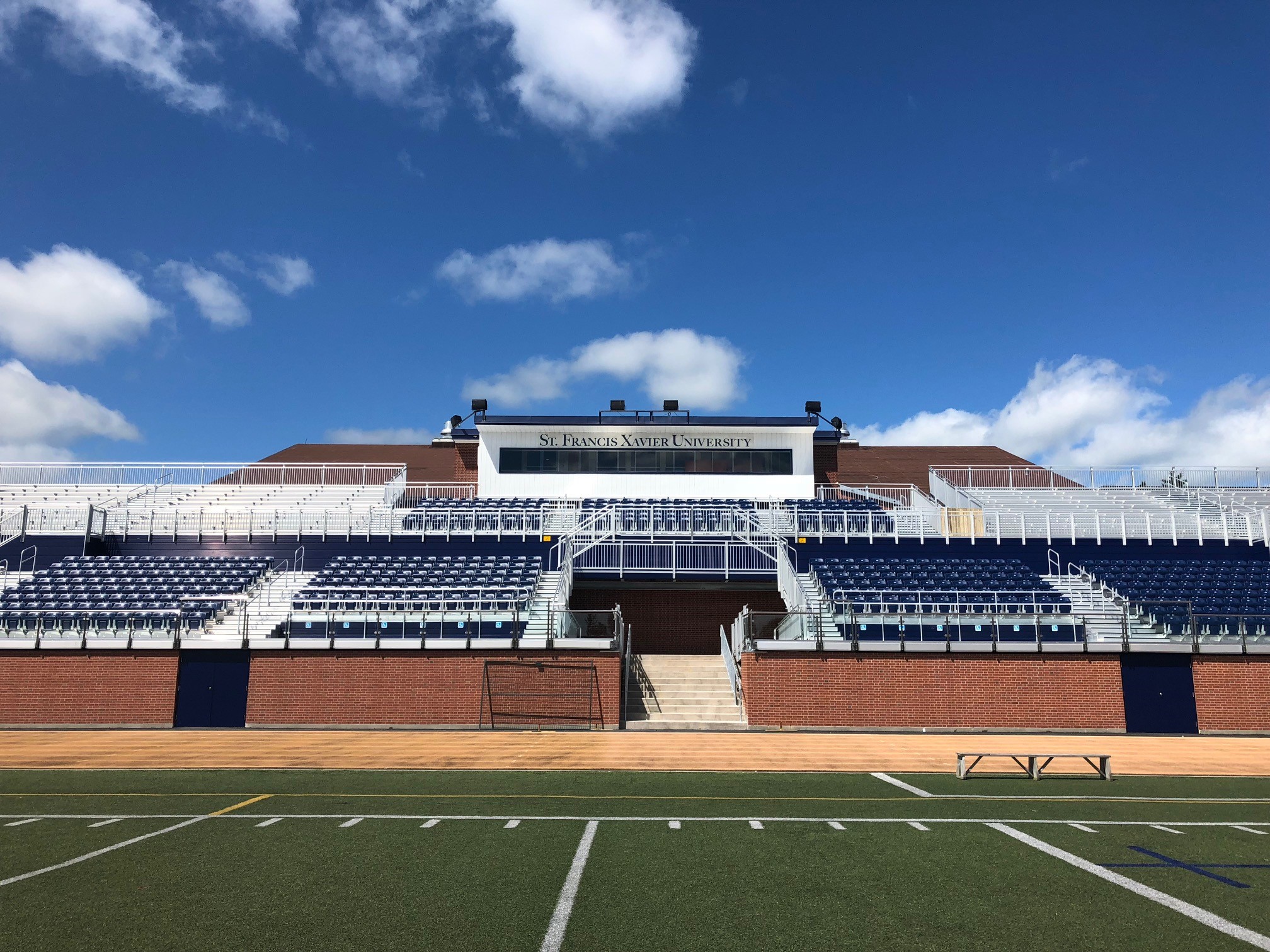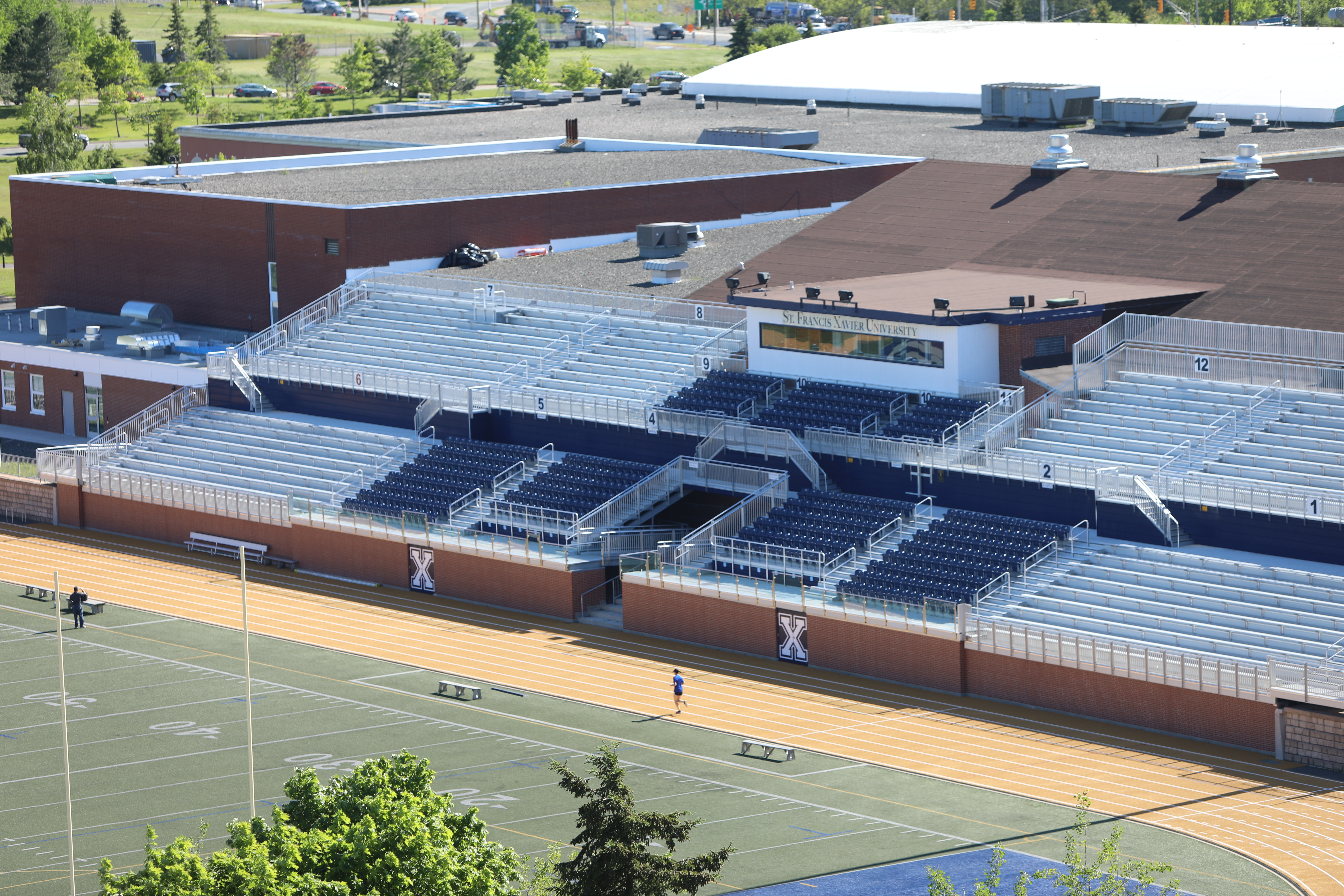 Making Antigonish a new sports tourism destination in the Maritimes, the StFX Stadium features 500 reserved seating spaces, (blue seats), 1850 bench seating, and 425 standing spaces. The Stadium includes an artificial field turf, an eight-lane 400m rubberized track, stadium lighting, perimeter fencing, state-of-the-art bleachers and technology.