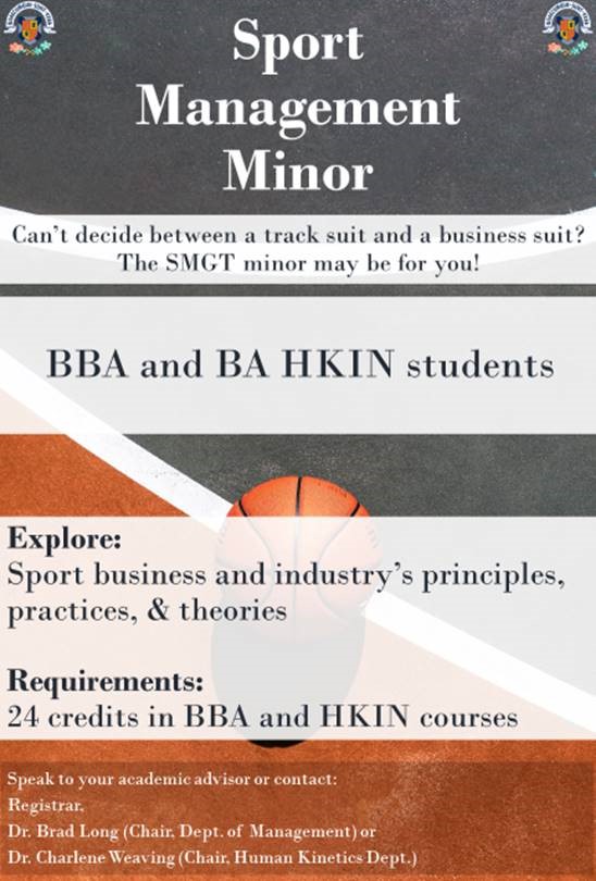 A Minor in Sport Management is an exciting option for students in either Business Administration or Human Kinetics (Arts). Launched in 2018 as a unique partnership between the BBA and HKIN programs, students in either program can complete 24 credits in foundational courses including sports ethics, sports marketing, sport history, and more. The field of sport management is broad, covering management in the context of professional, amateur, and intercollegiate sports as well as community recreation, and is experiencing rapid growth worldwide. This Minor prepares both BBA and HKIN students interested in pursuing an advanced degree in the field of sport management and for careers working with sports organizations (recreational and elite) and communities. Students earn the Minor concurrently with their chosen Major in either the Business Administration or Human Kinetics programs. The Minor begins with a first-year Introduction to Sport Management course and, progressing within a cohort, students who meet the eligibility requirements build upon this foundational material each year in courses that draw upon the concepts and skills brought to the Minor by both partnering programs.