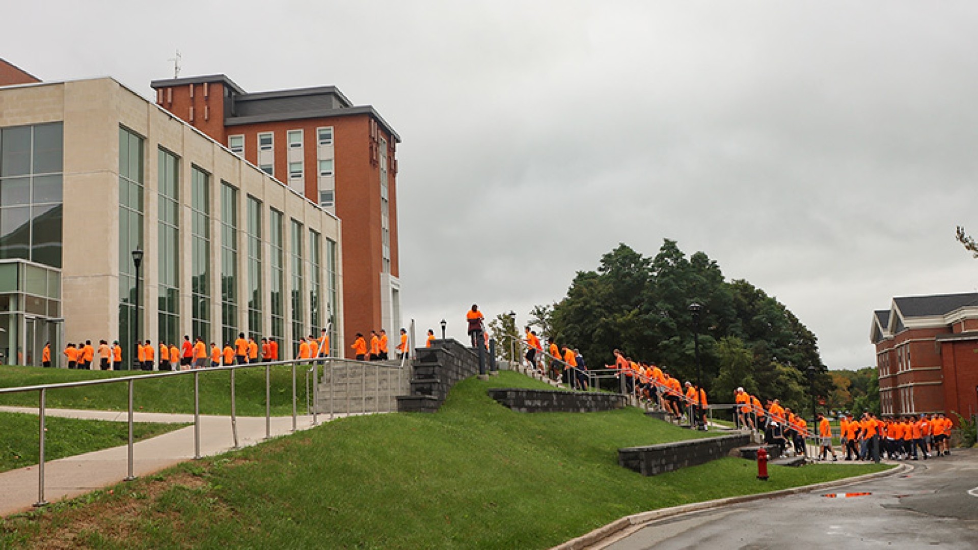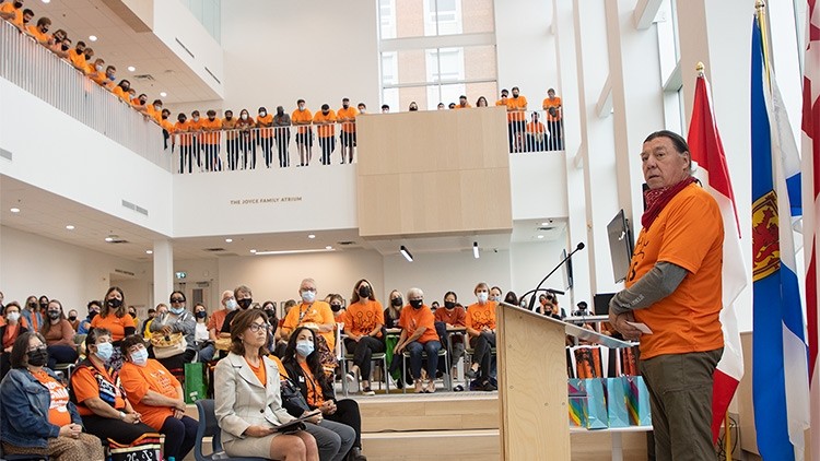 Many StFX students attended the event, including a large number from the StFX football team, who stood in solidarity, wearing orange t-shirts, lining the stairwells and upper floors of Mulroney Hall overlooking the Joyce Family Atrium.