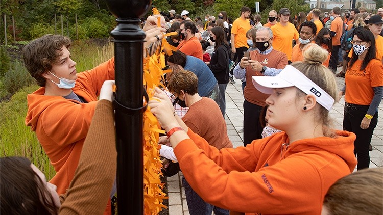 “Our shared history was never fully written about or talked about,” she said during a part of the ceremony held outdoors at Alumni Plaza where all those on hand were invited to tie an orange ribbon on an installation in memory of the over 6,500 children who lost their lives in the residential school system. Volunteer members of the Indigenous Student Society spent countless hours cutting the ribbons for the installation, which will remain on display for the month of October, Mi’kmaq History Month.