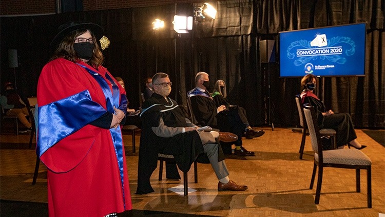 It was a day of double celebration as StFX President Dr. Andy Hakin was formally installed as StFX’s 19th President and Vice-Chancellor in a ceremony immediately preceding Convocation. Both ceremonies were celebrated virtually with a small, in-person stage party present in the MacKay Room, Bloomfield Centre.