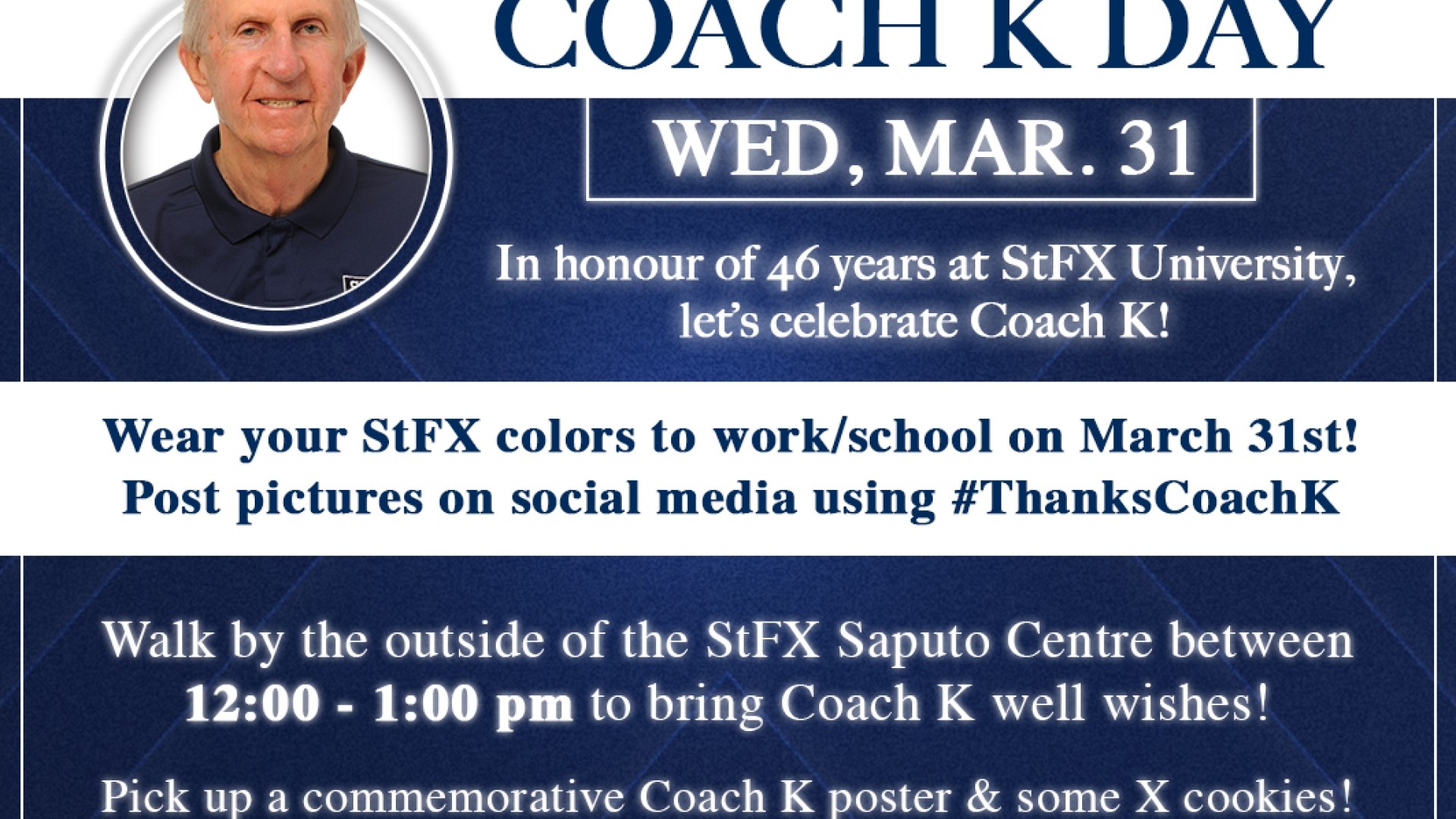 On Coach K Day, we encourage all students, faculty and staff – along with the greater Antigonish community and alumni across the globe – to wear their StFX colours on March 31st in honour of Coach K! Everyone is encouraged to dress in blue and white to school or work, wear your StFX branded clothing, and feel free to send out pictures on social media using the hashtag #ThanksCoachK.