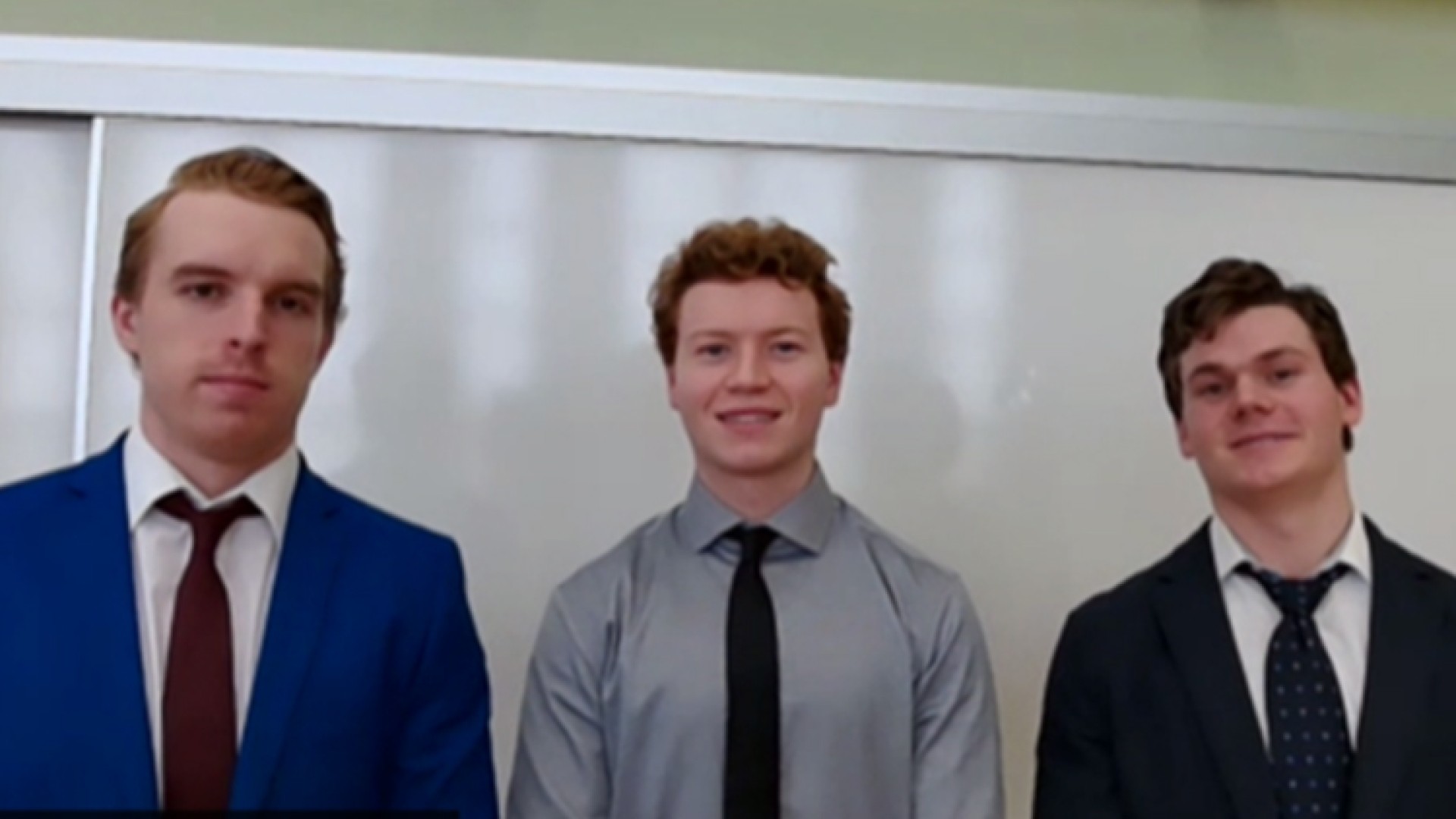 StFX students Nathan Hayes (team captain), Liam Rowland and Jay McKenna, who are coached by faculty advisor Dr. Vijay Vishwakarma, represented the Schwartz School at the competition, which took place virtually on Feb. 13, 2021 and included six teams from Atlantic Canada, including Acadia, Saint Mary’s, Dalhousie, Mount Allison, Université de Moncton and StFX.