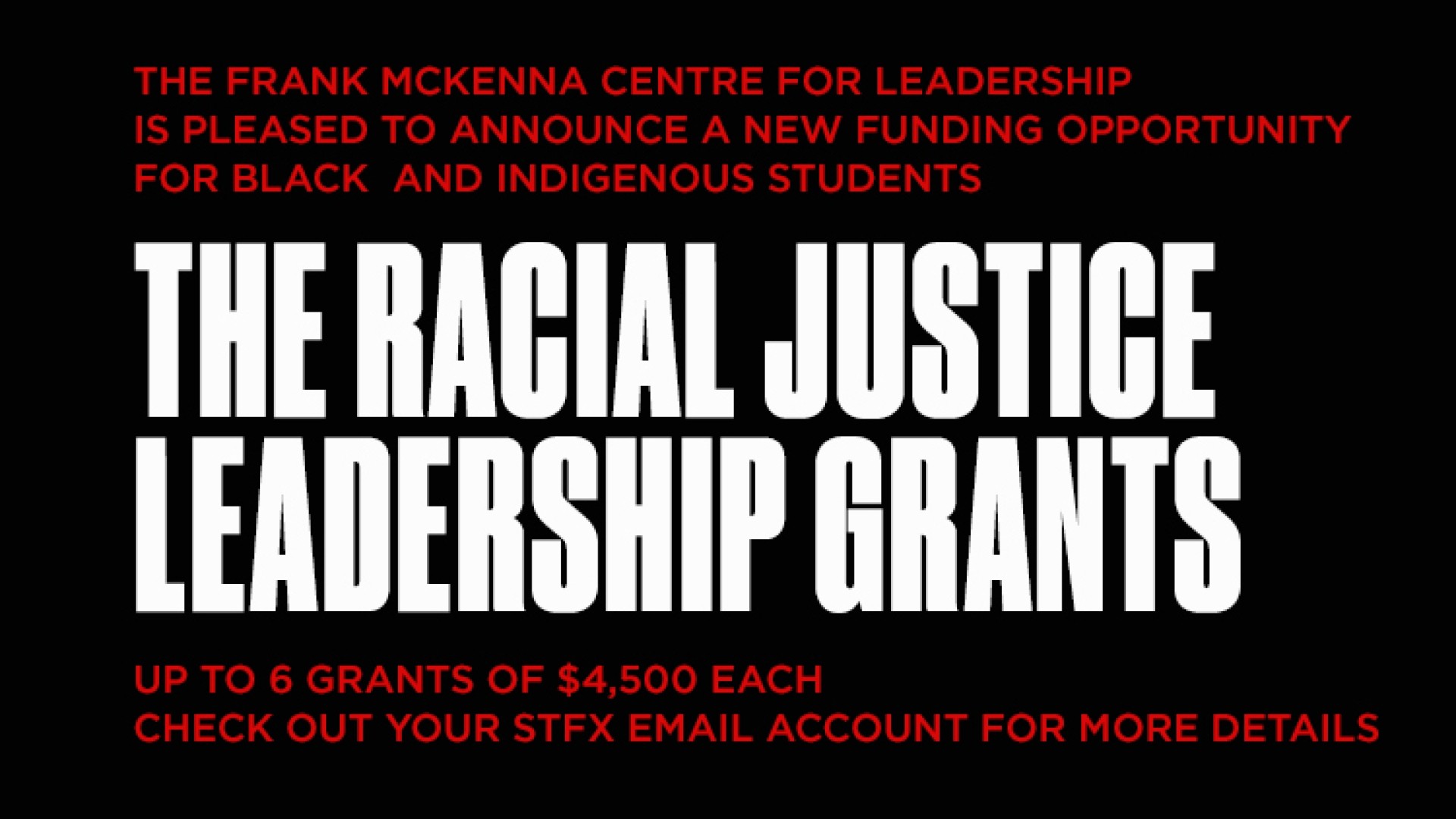 The Frank McKenna Centre for Leadership at StFX is pleased to introduce an annual funding opportunity for Black and Indigenous students, The Racial Justice Leadership Grants, which are designed to provide students with funding and institutional resources to support projects that include research, organizing and outreach work, or advocacy in activism in the area of racial justice.