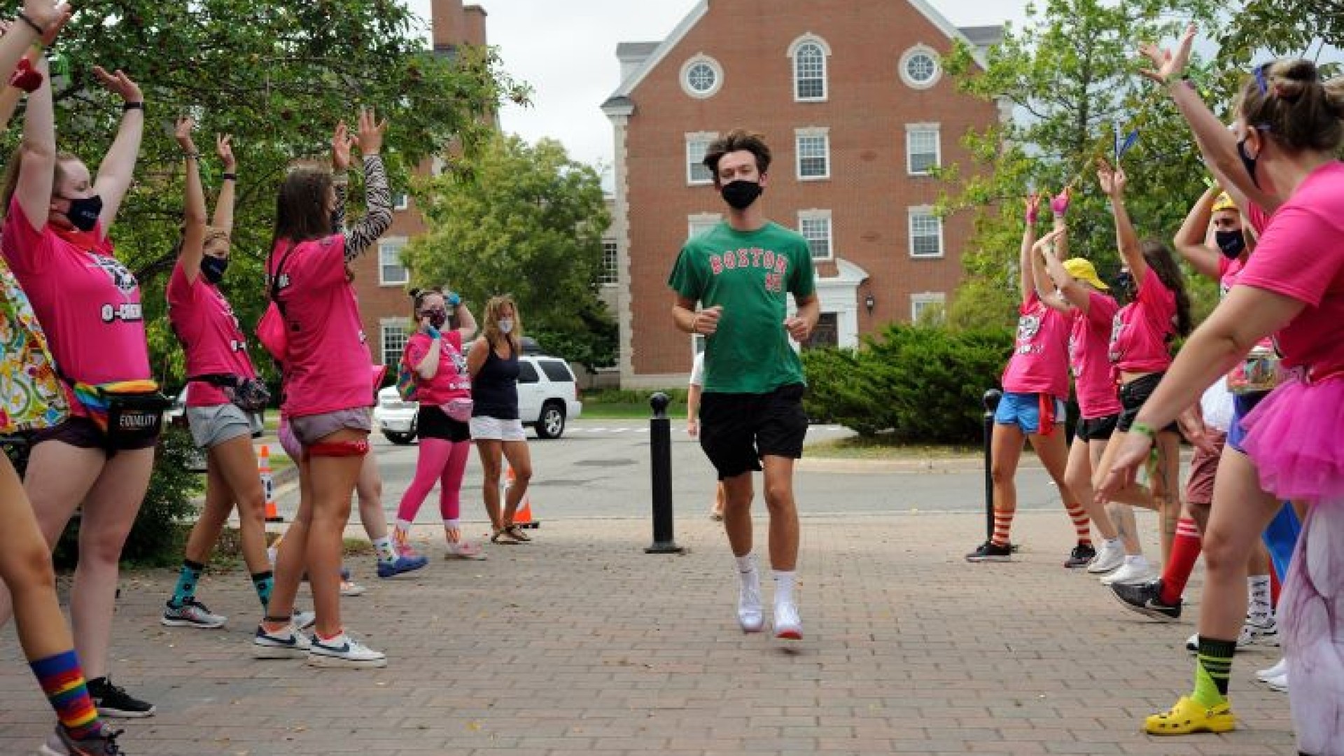 Pink-shirted members of O-Crew are there to greet students and help direct people, bringing their energy in a masked and physically distanced way.